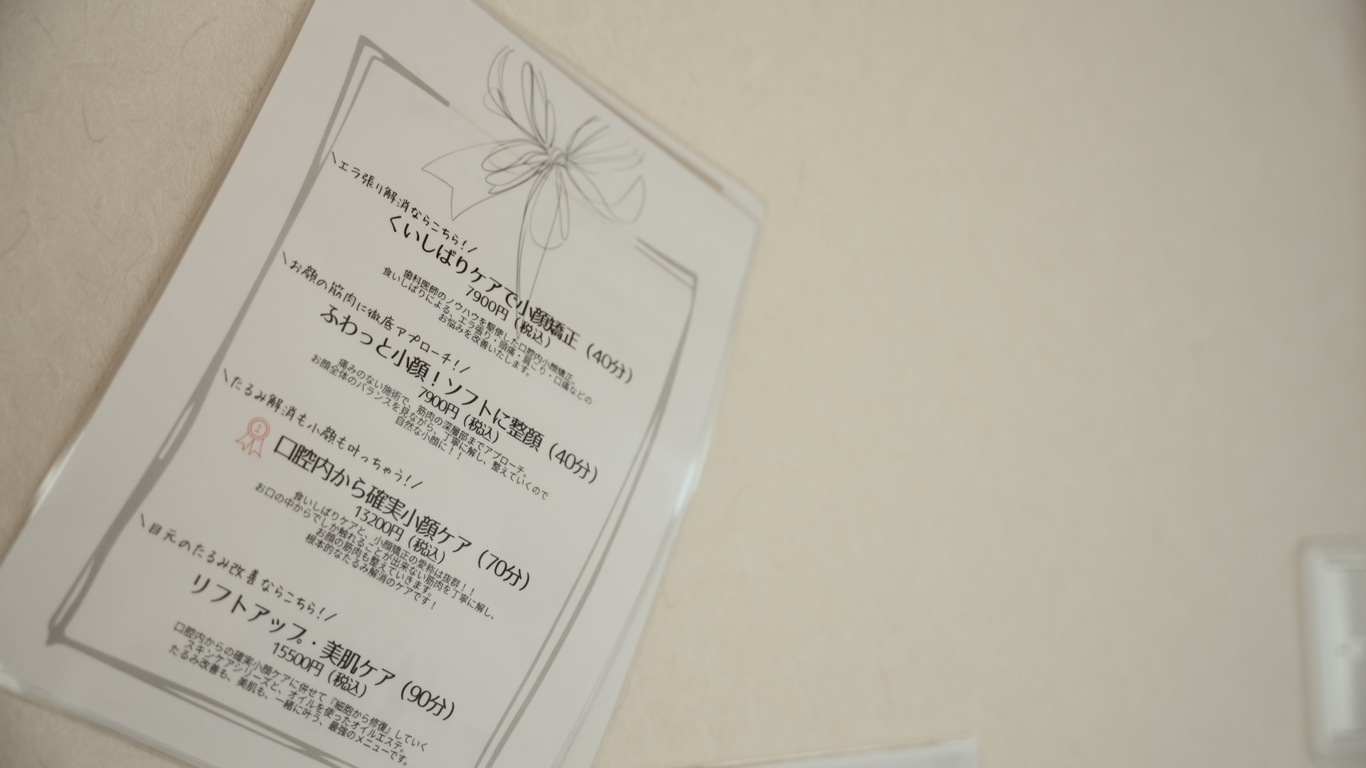 サロンでは主に5つのメニューを提供しており、中でも食いしばり解消と小顔矯正がセットになった「口腔内から確実小顔ケア」が人気です。